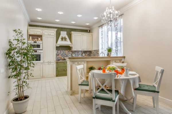 На кухне в стиле французской провинции царит атмосфера деревенского покоя и неспешности. Ее создают деревянные шкафчики, выкрашенные светлой краской, ситцевые шторки, пасторальные рисунки. Прованс гармонично дополняет техника и аксессуары из ретро-коллекций «а-ля XIX век», вытяжка в виде побеленной печной трубы, медные смесители, керамическая фурнитура. Очень уместно на такой кухне смотрится круглый обеденный столик с изящными стульями вокруг.