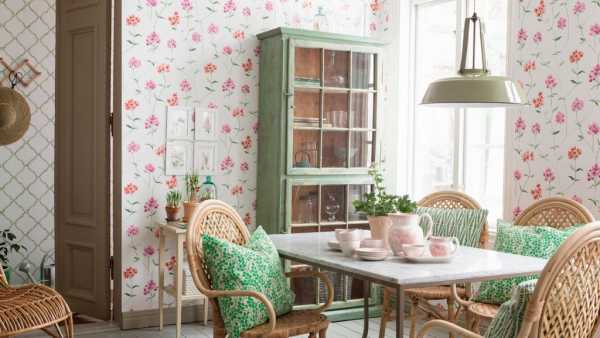 - Дизайн гостиной в стиле прованс подчеркнут обои с цветастым принтом.