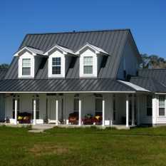Профнастил из металла также достаточно распространенный материал для кровельных работ. Насыщенная цветовая палитра придаст внешнему облику дома нарядный и привлекательный внешний вид. Качественные характеристики, функциональность, а также невысокие цены позволяют использовать материал для разнообразных отделочных работ: облицовке стен, производства заборов и ворот. Таким образом, появляется хорошая возможность для воплощения единого архитектурного замысла.