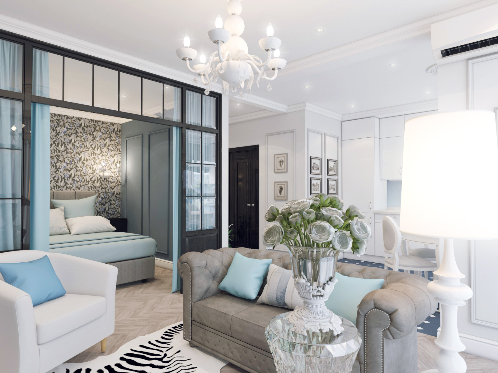 Еще один популярный прием, который используется многими дизайнерами – использование разных цветов и их оттенков. В маленьких однокомнатных квартирах часто используют светлые цвета: оттенки бежевого, голубого, розового, серого или белого. Насыщенные яркие или темные цвета используют для расстановки акцентов.