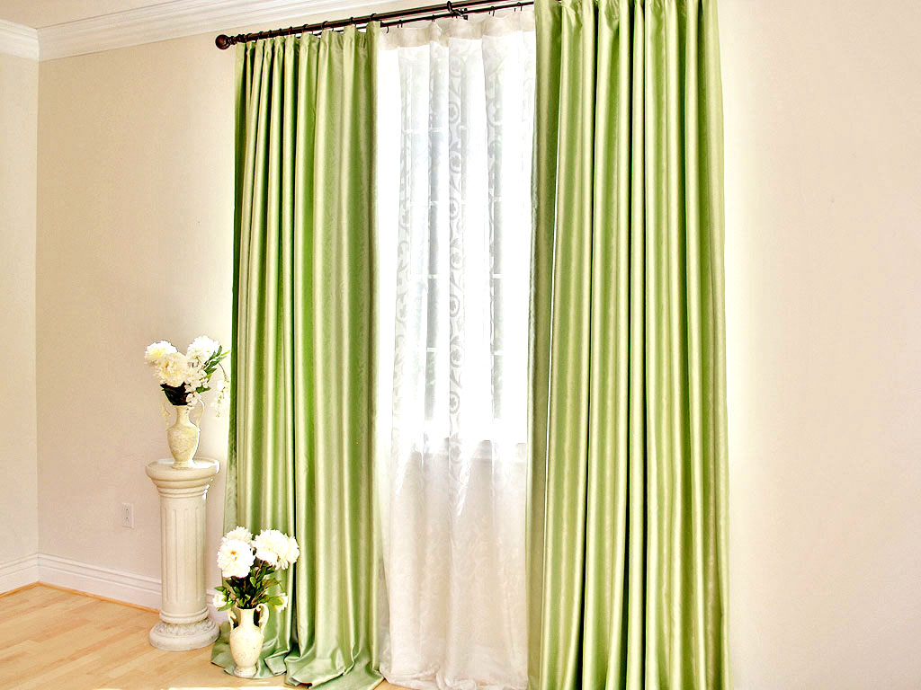 Светло-зеленые шторы хорошо сочетаются с белым потолком или белой мебелью. Можно прибегнуть к отделке стен бело-зелеными обоями