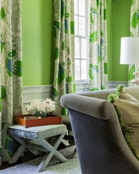 Яркий и активный весенне-зеленый с такими же шторами будет со временем действовать раздражающе. Разбавленный белым или сиреневым рисунком, придаст интерьеру приятную динамичность.
