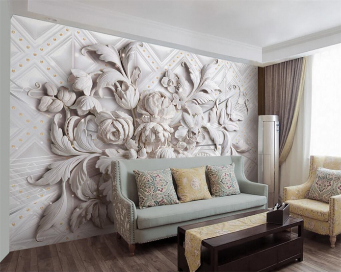 Пример можно увидеть на фотографиях. Здесь наглядно видно, как крупное изображение цветов расширяет зал. Происходит это за счет объемных крупных бутонов. Мелкий рисунок наоборот делает стену более плоской. Потому важно выбирать фотообои в гостиную, которые выглядят объемными, или же обращаться к светлым тонам.