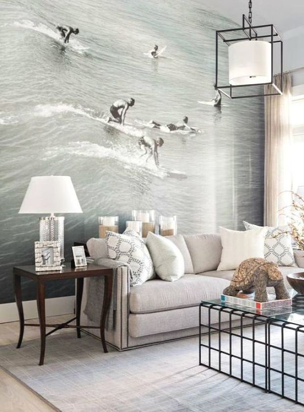 На фоне морских тематик хорошо вписываются яркие голубые диваны. Если вы хотите разместить фотообои над стеной с низкой стенкой, которая является довольно яркой, стоит также дублировать ее цвета на стене. Например, с классической современной стенкой светлых тонов, будут отлично сочетаться изображения с белыми лилиями и розами. Но в случае, если стенка яркая, например, имеет красные вставки или элементы серебра, лучше выбрать маки на белом или сером фоне.
