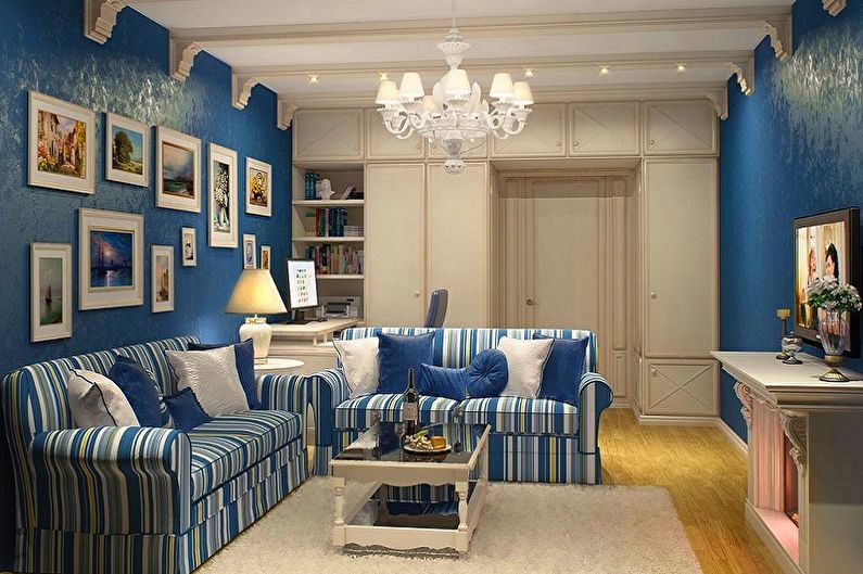 Пестрая мебель, независимо от цвета, органичнее смотрится на однотонных стенах. Если же вы все-таки задались целью применить фотообои в интерьере с такой мебелью, стоит обратить внимание на нейтральные оттенки и спокойные композиции. Например, диван с синей полоской хорошо будет сочетаться с приглушенными фотографиями ирисов. А кресла с обивкой в горох органично встанут на фоне обоев с минимальным количеством элементов того же оттенка.