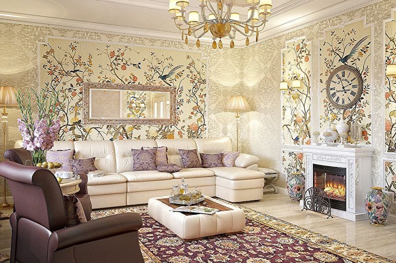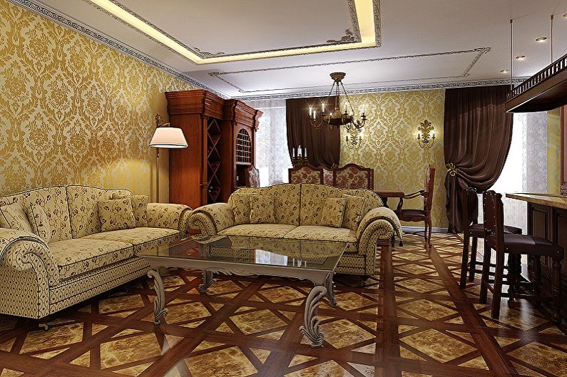 Красивым решением для гостиной станет неоклассический стиль. Он отображает все традиционное, изысканное и элегантное. Для отделки используются качественные дорогие материалы кофейных, жемчужных и серовато-коричневых оттенков.