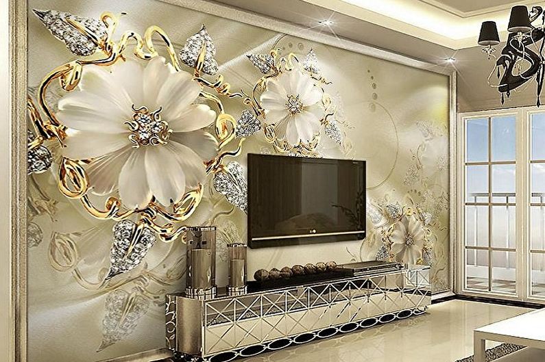 - Большой выбор на любой кошелек. Обои для дизайна зала с фотообоями можно подобрать с любым бюджетом. От стоимости зависит качество материала, на котором печатают изображение и его стойкость к влаге и другим внешним факторам.