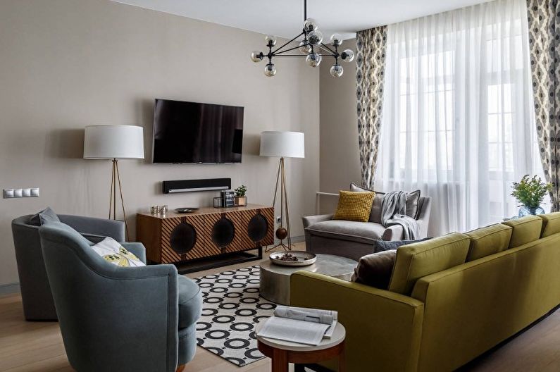Если своя гостиная видится ультрасовременной и модной, не обязательно останавливаться на лаконичных классических стилях. Ведь и ар-деко, и лофт, и контемпорари каждый по-своему современен.