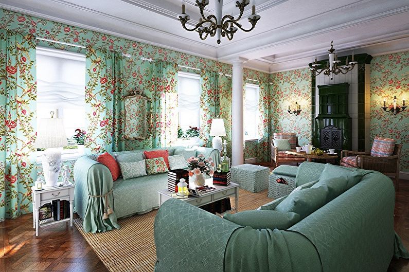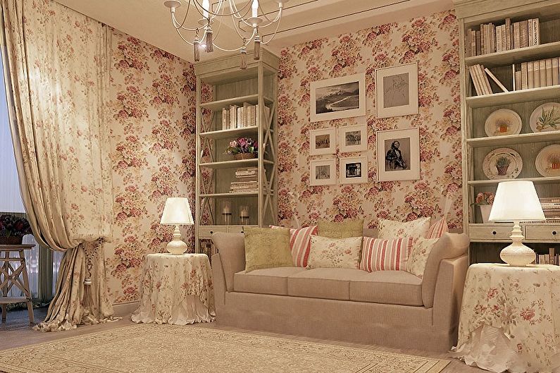 Отлично смотрятся обои в романтическом стиле исполнения. Прованс будет уместен в разных по площади комнатах. Так что для маленьких залов этот вариант – хорошее решение.