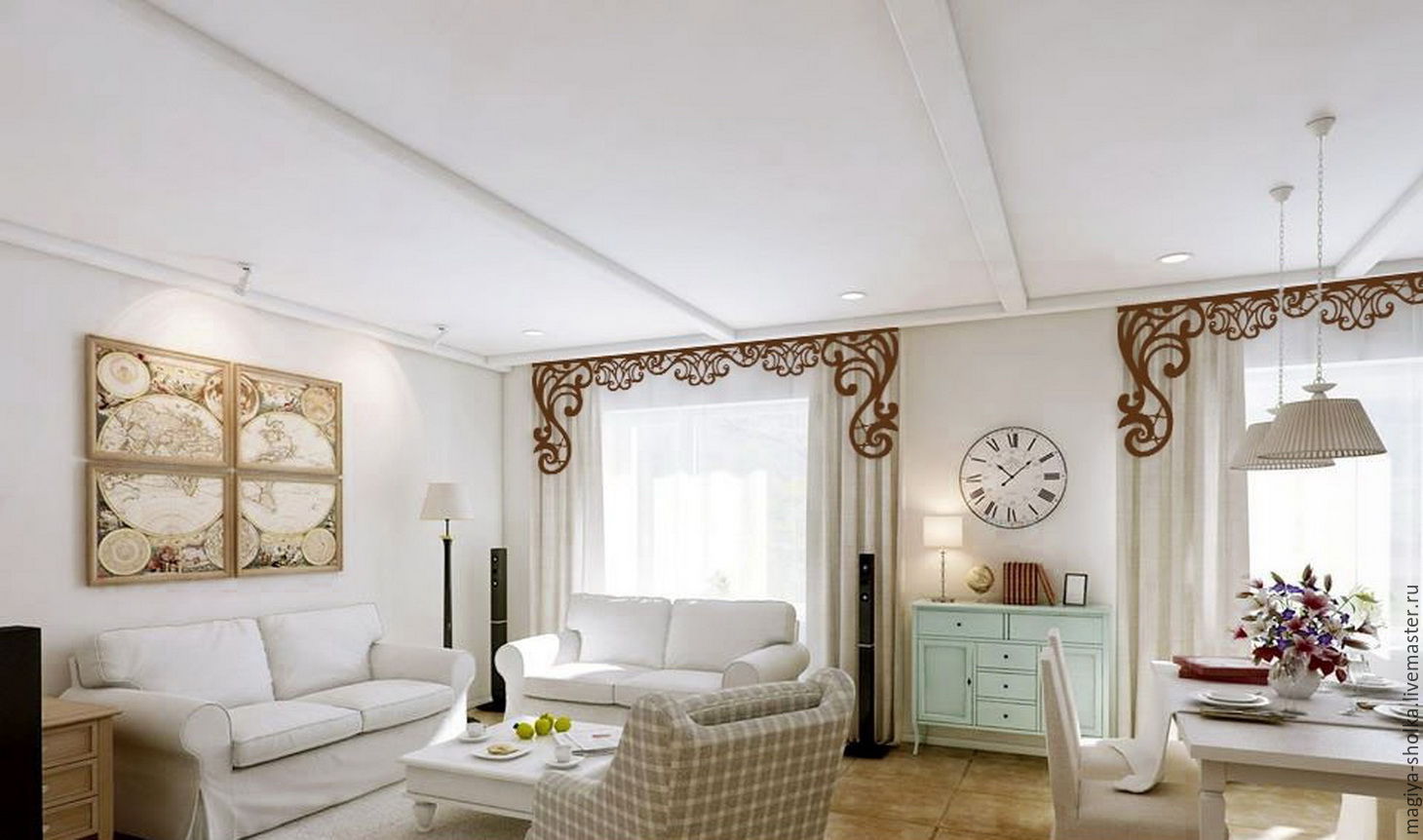 Из перечисленных фрагментов формируется единая композиция ажура. Когда карниз имеет недостаточную длину для закрепления всех деталей, можно составить композицию поэлементно. Для придания фигурной формы центральную часть комбинируют со всеми угловыми, а если использовать центральный фрагмент в качестве акцента, то останется обыграть его меньшими элементами. Вариантов много.
