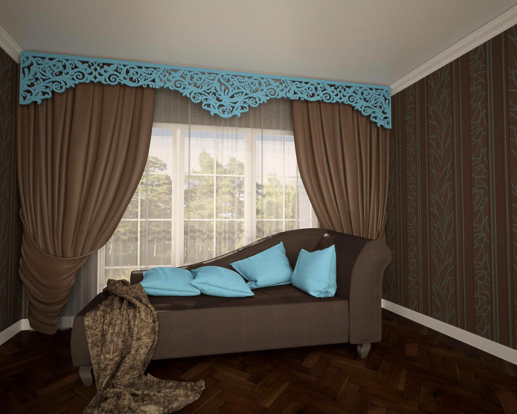 В стандартных квартирах, где потолки редко бывают высокими, визуально изменить пропорции пространства можно с помощью широкой планки с резным узором. Если узор с тончайшими линиями будет выдержан в тёмной гамме, то можно не опасаться эффекта утяжеления шторной композиции.