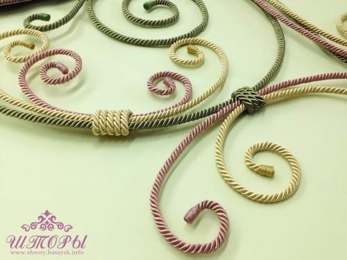Основа ламбрекена выполнена из мебельного шнура с прочной стальной внутренней нитью, которому придаётся заданная форма в соответствии с эскизом. Дополнительным декором служит бахрома, пайетки, стеклярус и всевозможная фурнитура. Задействование нескольких шнуров разного цвета, образующих сложное переплетение, позволяет добиться эффекта объёма, и такие изделия выглядят по-настоящему роскошно. Вместо плоских и прямых плоскостей, ламбрекен из шнура демонстрирует сочетание фактурных и объёмных изгибов.
