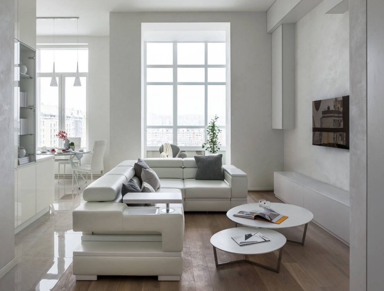 Современность, но в совершенно другом стиле. Минимализм часто можно ассоциировать с белизной исследовательской лаборатории. Но всего несколько аксессуаров, например, зеленого цвета, позволяют взбодрить такой стиль. Простая форма белых гостиных поражает функциональностью решений.