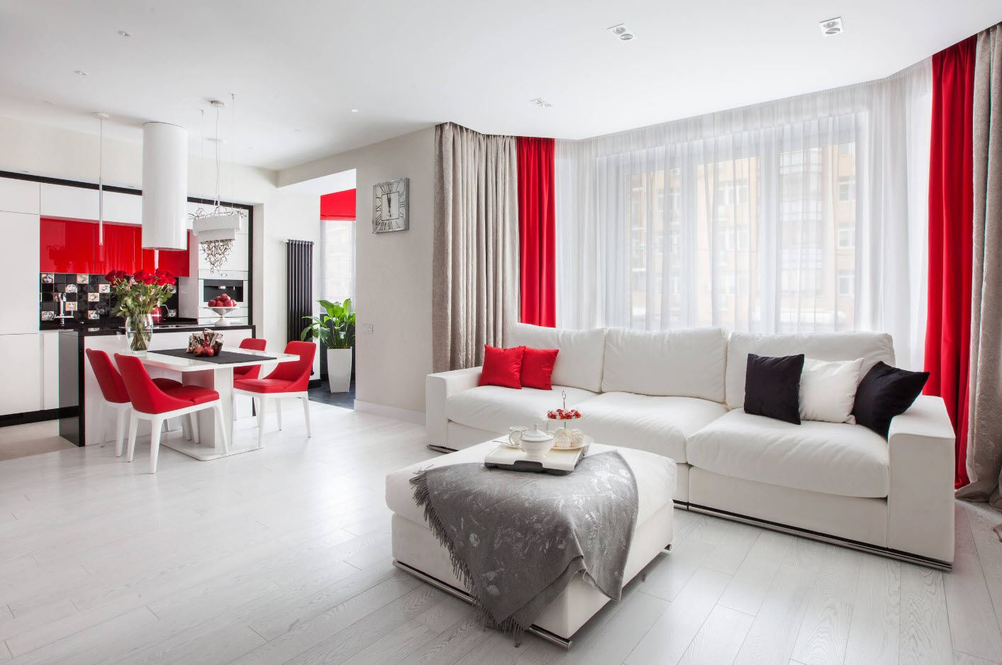 Если вы хотите украсить современную белую гостиную, подумайте, хотите ли вы добиться конечного эффекта благодаря различным структурам и материалам, или желаете ввести какой-то дополнительный цвет. Монохромную версию гораздо сложнее реализовать, потому что, к сожалению, белая расцветка имеет свои оттенки. Бывает, что сочетание двух элементов рядом создает некоторый диссонанс. Может оказаться, что один белый будет желтым, а другой сместится к ярко-серому. Когда вы поставите их рядом друг с другом, то вместо радости у создастся впечатление, что одна из этих вещей старая и изношенная. Вот почему более опытные декораторы рекомендуют сочетание белого с некоторым контрастным цветом. Это придаст эффект свежести и современности, и в то же время защитит вас от неприятных сюрпризов. Посмотрите несколько предложений белой гостиной и выберите для себя максимально подходящий вариант.