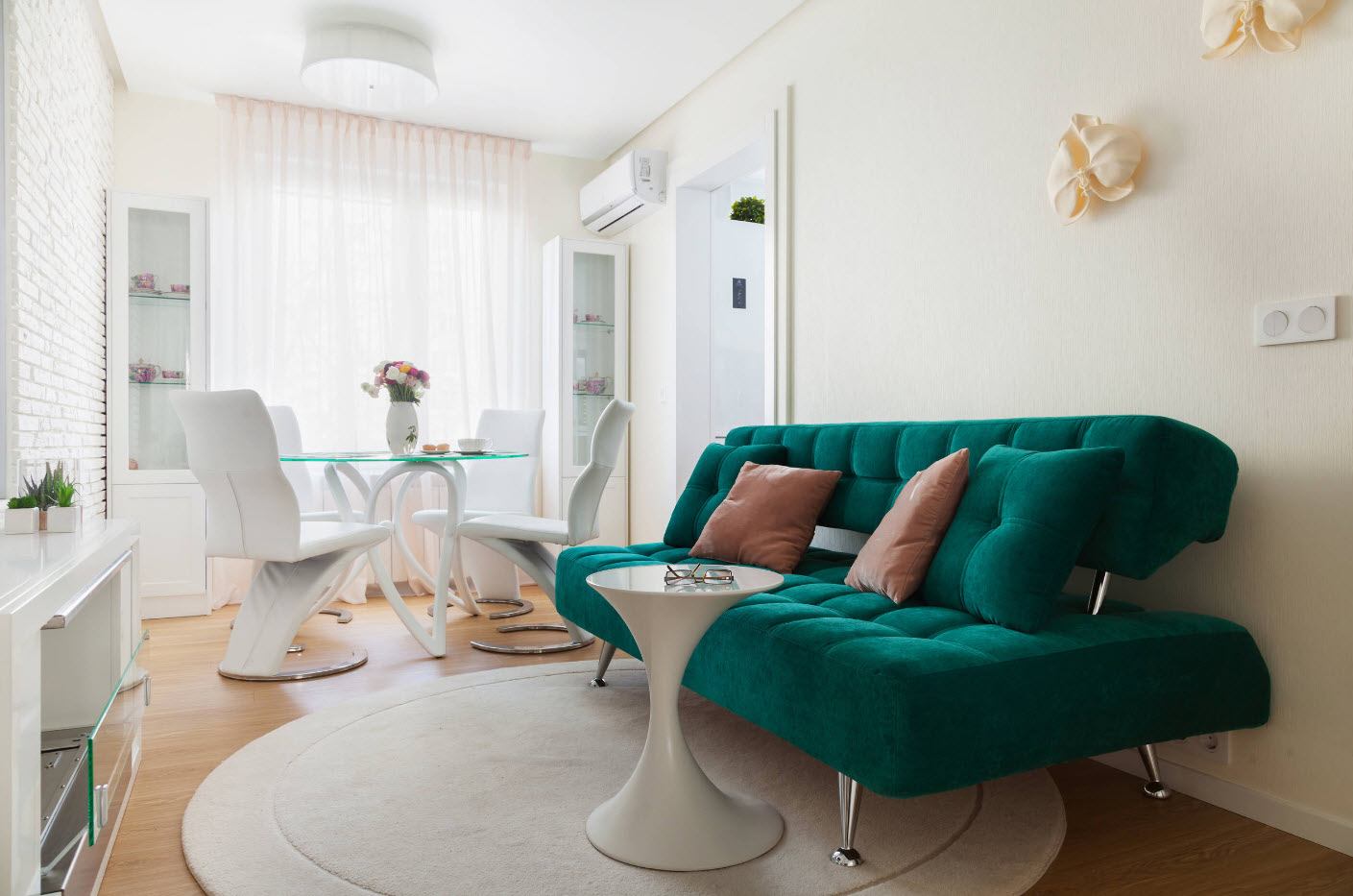 Современность, но в совершенно другом стиле. Минимализм часто можно ассоциировать с белизной исследовательской лаборатории. Но всего несколько аксессуаров, например, зеленого цвета, позволяют взбодрить такой стиль. Простая форма белых гостиных поражает функциональностью решений.