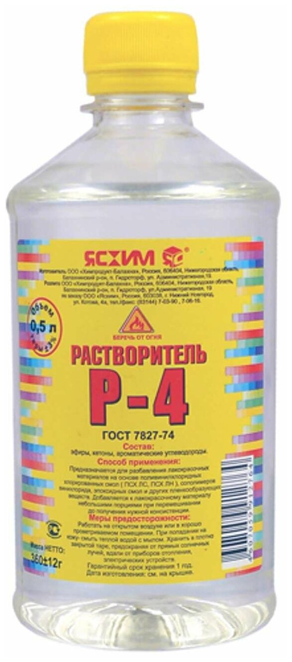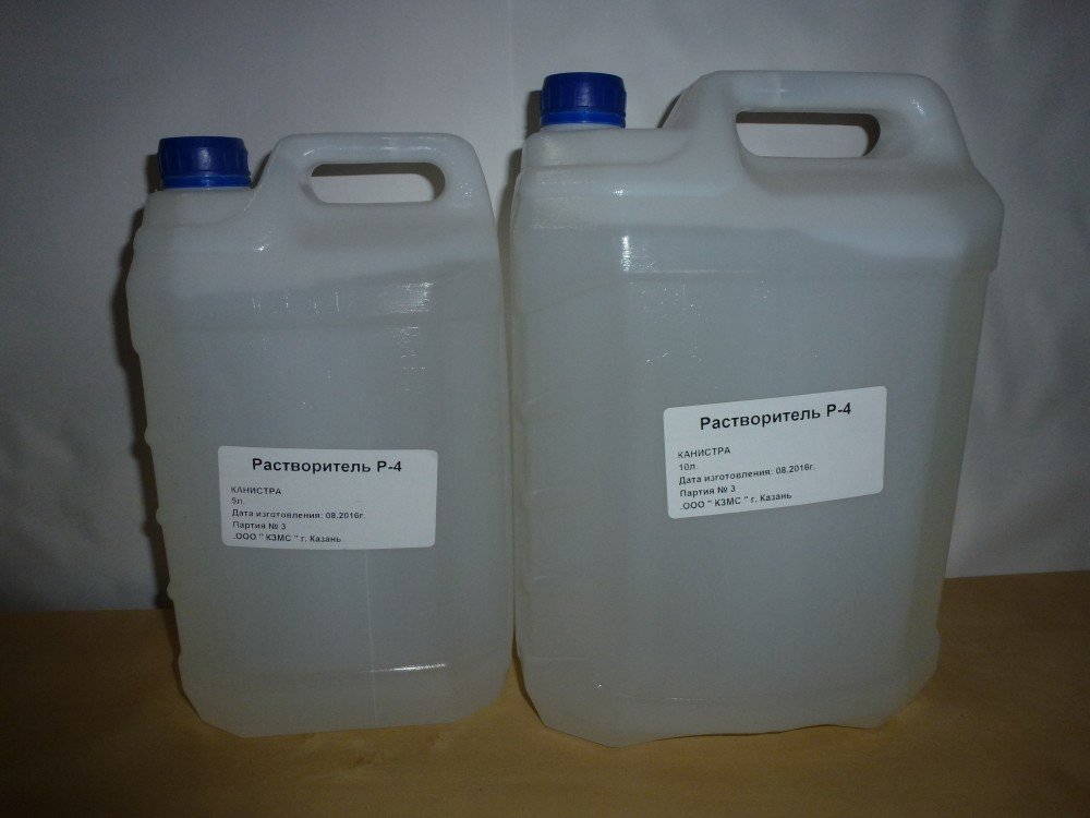 Растворитель Р-4 предназначен для быстрого и эффективного разбавления ЛКМ на основе поливинилхлоридных хлорированных смол ПСХ ЛН и ПСХ ЛС, эпоксидных смол, сополимеров винилхлорида и иных пленкообразующих веществ (кроме серой и защитной эмали ХВ-124). Он состоит из 62% толуола, 26% ацетона и 12% бутилацетата. Одна из его разновидностей, растворитель Р-4А используется для разбавления ОКМ выполненных на таких же основах, как и в случае с Р-4.