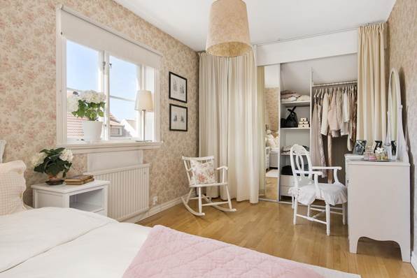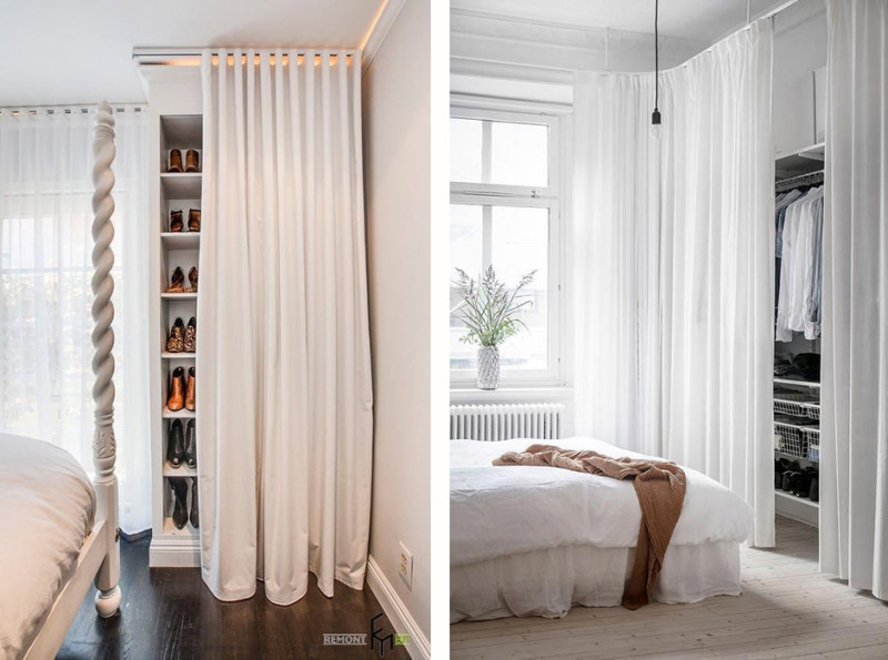 Легкая светлая ткань в том же оттенке, что и отделка стен скрывает гардеробную комнату. Если же продлить эти шторы до окна, можно совсем растворить такую нишу в помещении — будет казаться, что ткань маскирует еще одно окно.