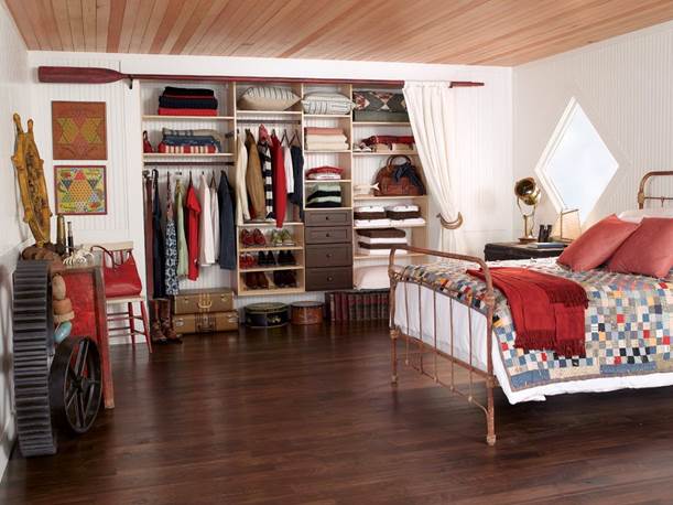 Бывают случаи, когда для хранения гардероба отведено пространство неправильной формы, со сложными изгибами и скосами. Например, под мансардной крышей или лестницей. Красивая занавеска, закрепленная оригинально, и при этом прочно, позволит использовать пустующую площадь по максимуму.