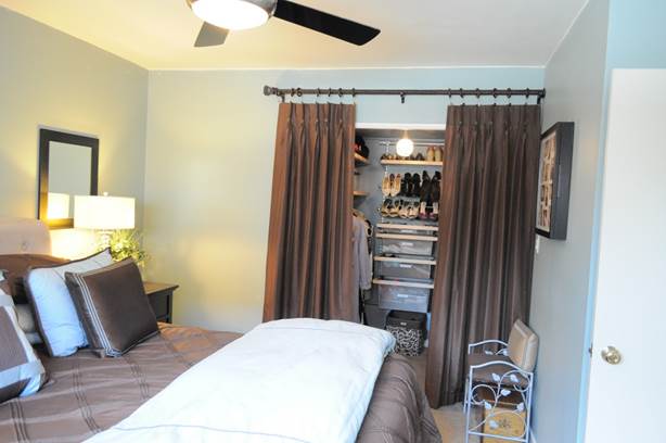 - Выбрав ткань в качестве альтернативы дверцам в гардеробе вы тем самым лишите себя возможности использовать здесь зеркала. Возможно, они вам не нужны, но зеркальные дверцы отлично помогают визуально увеличить пространство.