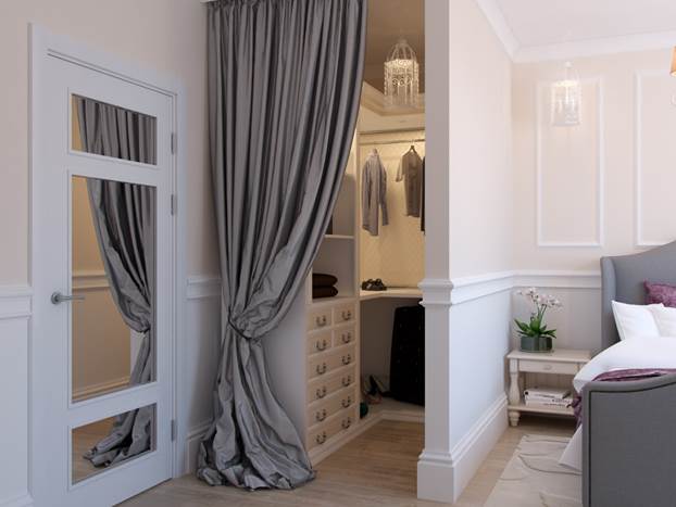 - Штора может как скрыть, так и подчеркнуть наличие гардеробной комнаты.