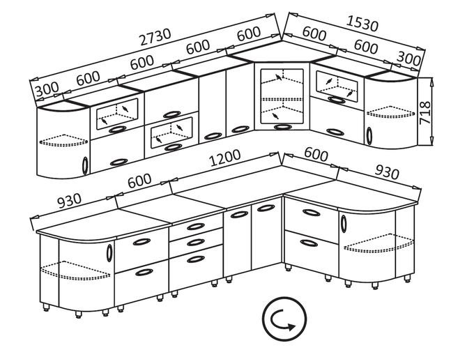 Отличительной особенностью обладает угловой кухонный гарнитур. Угловой кухонный шкаф может быть нескольких вариантов: прямой (рис. 2) и с углом 135 градусов (рис. 3). Та же особенность относится и к верхнему ряду (рис. 4).