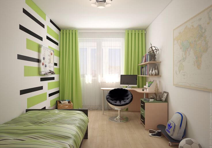 Угловой вариант стенки с рабочим столом лучше установить ближе к окну, самый оптимальный вариант – напротив или сбоку. Затем определяют положение системы хранения, зоны отдыха и сна. Кровать располагают ближе к радиатору, чтобы было комфортно спать. Изголовье располагают так, чтобы было видно входную дверь.