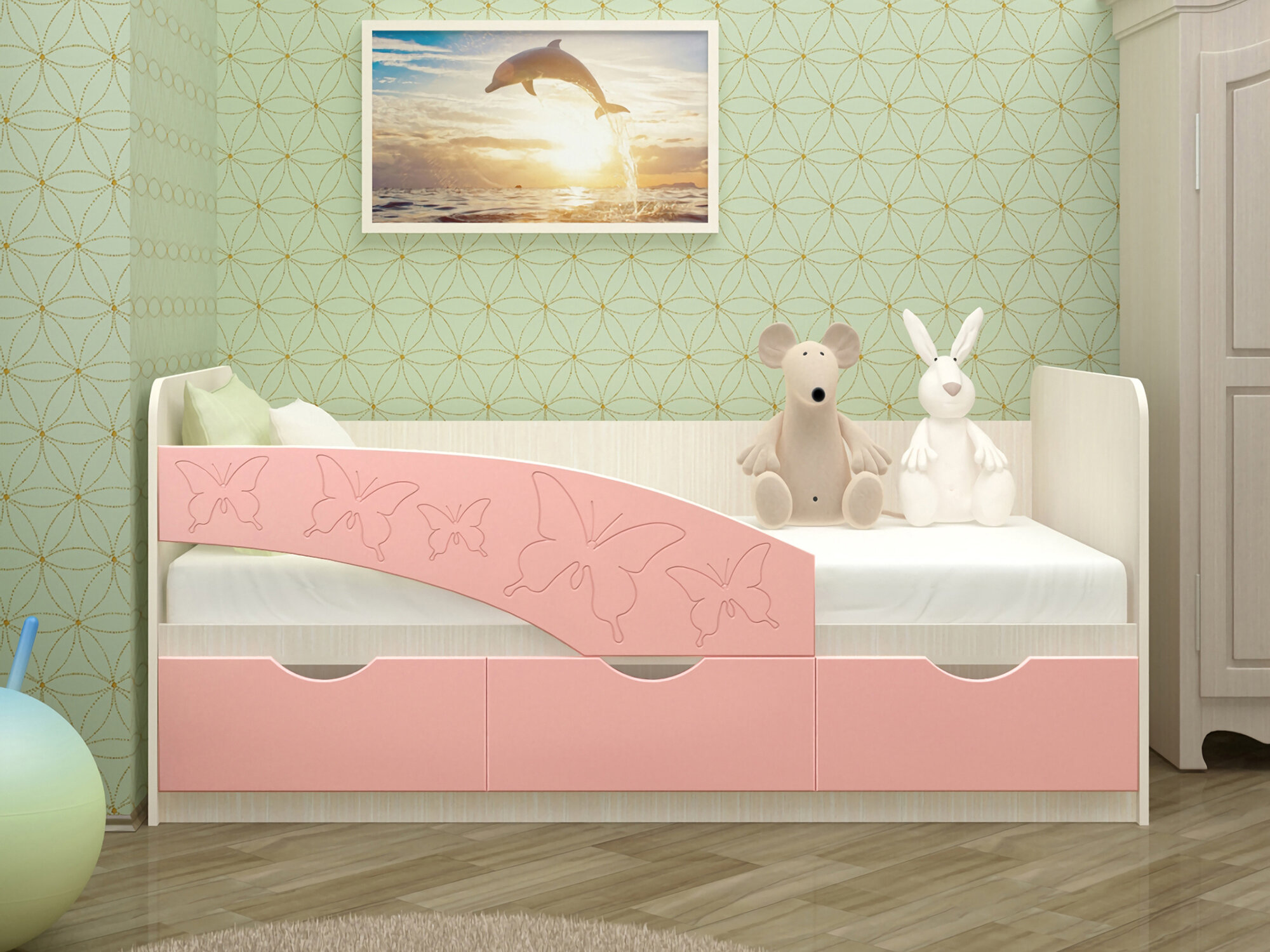 Плюс этого выбора – отсутствие проблемы покупки мебели в детскую на ближайшие 10–12 лет. А вот к минусам можно отнести отсутствие индивидуальности у спального места ребенка. Хотя наклейками, красками и другими подручными материалами он легко может исправить эту оплошность. В качестве дополнительного места хранения такие кровати часто комплектуются прикроватными тумбами или корзинами.