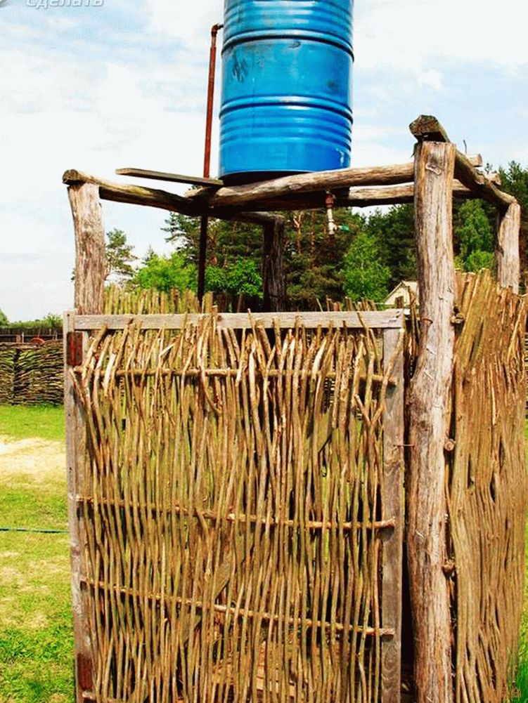 Наиболее простым вариантом, не требующим работ по сооружению отдельной кабины, служит обычное ведро с пробитыми мелкими отверстиями. Его подвешивают на удобную высоту, заливают теплую воду и импровизированный душ готов. Можно установить вокруг столбики, на которые натягивают ткань, чтобы ограничить обзор.