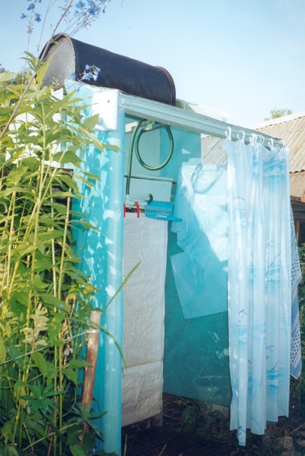 Утеплив стены и крышу пенополистиролом, обшитым сверху ПВХ-пленкой, добиваются возможности использования душа в весенне-осенний период.
