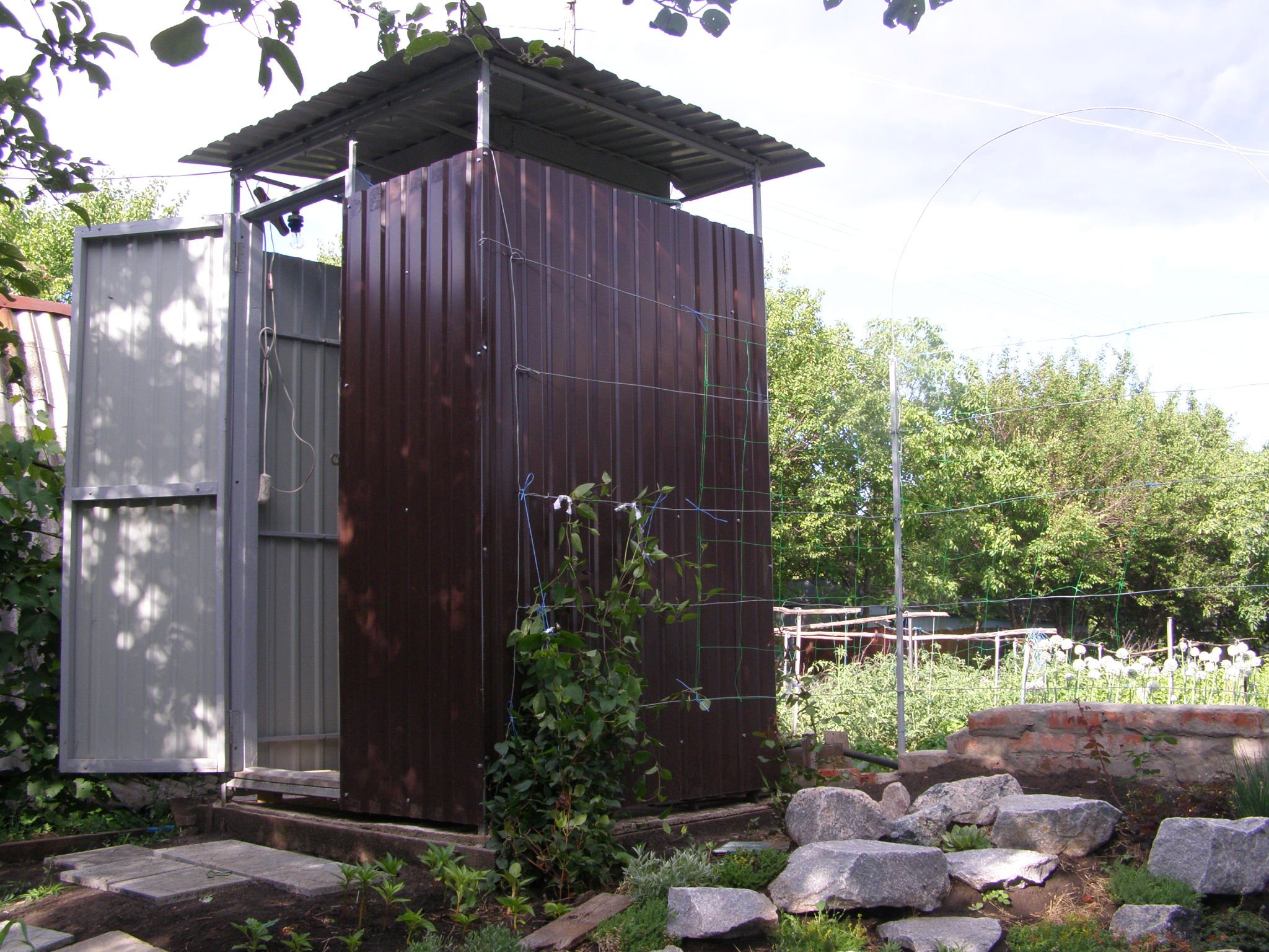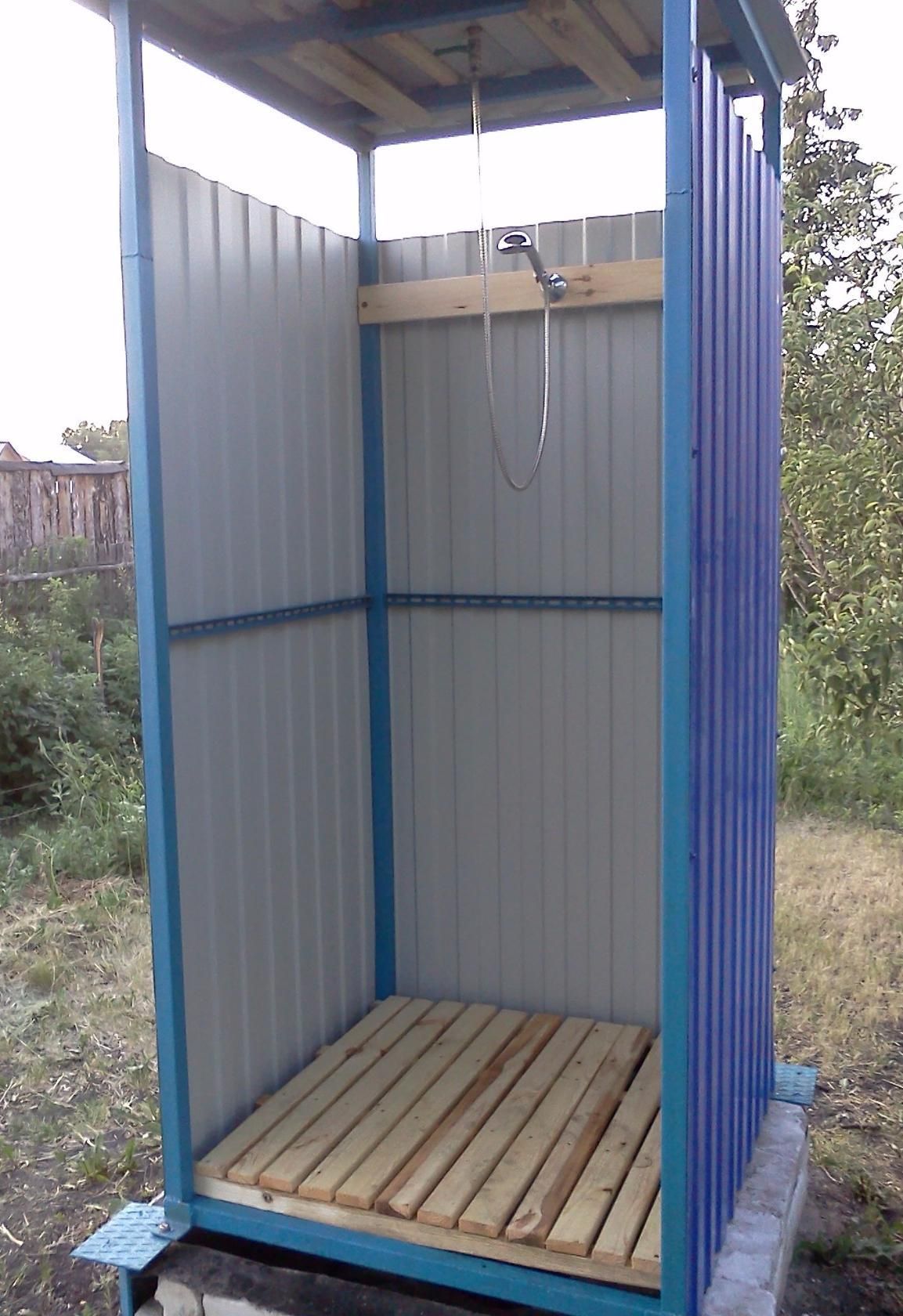 Каркас душа можно выполнить, как из дерева, так и металла. Рекомендуется предварительно при помощи сварки изготовить рамку из металлического профиля или древесных брусьев. Затем к ней крепится профнастил оцинкованными саморезами, снабженными уплотнительными шайбами. Сначала обшиваются стены, затем монтируется непосредственно дверь.