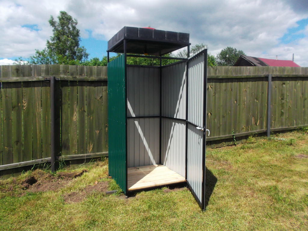 - Остается разрезать по размерам поликарбонат и зафиксировать на каркасе при помощи саморезов. Устанавливают наверху резервуар для воды. Рекомендуются пластиковые плоские баки. Они могут исполнять роль крыши при точном соответствии размерам кабинки.