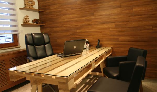 Это хороший стол для совещаний, идеально подходящий для офиса. Как видите, он сделан из деревянных поддонов и имеет простой и довольно грубый дизайн, который контрастирует с остальной частью декора.