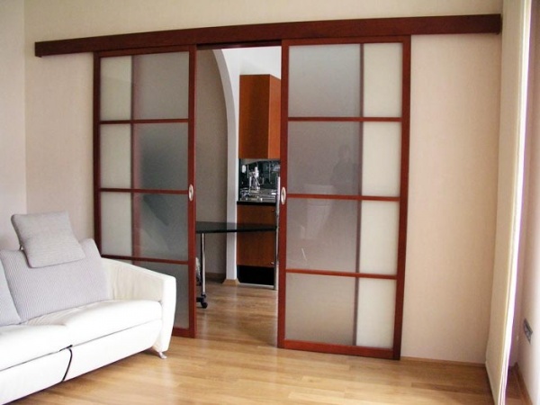 Многофункциональный тип, такие изделия очень удобны в эксплуатации. Для раздвижных купейных дверей между комнатой и кухней применяются те же механизмы, что и в шкафах-купе. Полотно выглядит стандартно.