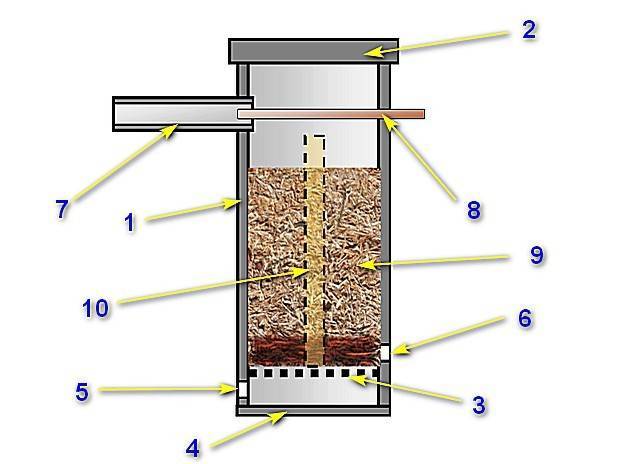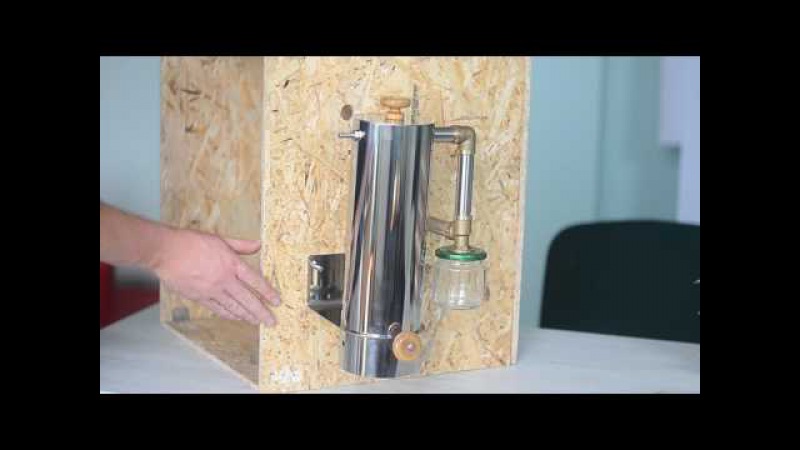 Зола попадает после отработки в специальную емкость, аппарат содержит и элемент, контролирующий температурный режим и добавление деревянной щепы. Узел имеет установку на обеспечение стабильности режима для поддержания опилок исключительно в тлеющем состоянии, предотвращая горение.