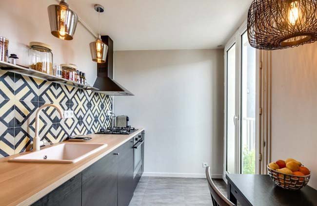 В зависимости от вида раскладки, меняется восприятие кафеля в зоне фартука. Иногда комбинируют фрагменты разных размеров на одной стене, воплощая идею дизайна.