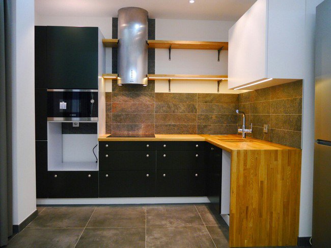 Плитка черного цвета — прекрасно впишется практически в любой интерьер. Однако лучше выбирать такой оттенок для обустройства достаточно просторной кухни. Выглядит этот материал очень стильно и элегантно, при этом на его поверхности практически незаметны загрязнения. Это означает, что мыть его часто не придется.