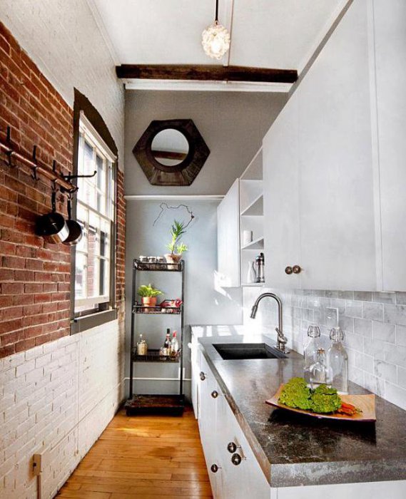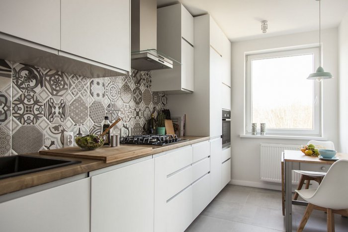 Идеальный вариант для обустройства кухонного фартука в помещении скромных размеров — использование некрупной плитки светлых оттенков с глянцевой поверхностью. Такое решение позволит визуально увеличить пространство, наполнить его светом и сделать более легким.