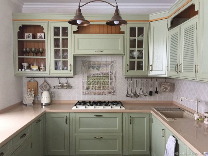 Плитка зеленого цвета — данный вариант прекрасно подходит для обустройства кухни в деревенском стиле, а также в стиле прованс. Известно, что зеленый цвет успокаивает и дарит умиротворение. Желательно, чтобы в такой кухне присутствовали элементы из натурального дерева, а также хороший добротный текстиль (тоже натуральный).