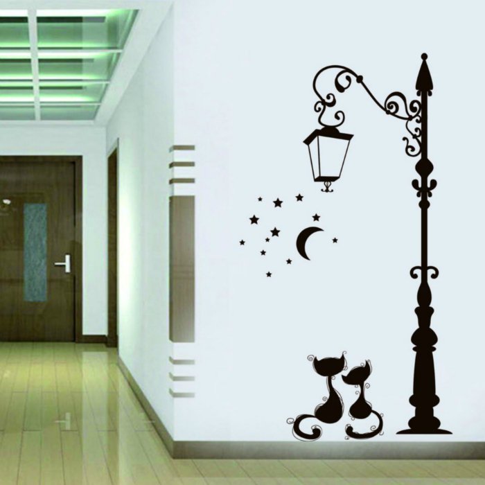 Если вы поклонник всего не традиционного и оригинального, вам не стоит даже задумываться об использовании обычных геометрических или цветочных узоров. Лучшим вариантом станут трафареты, на которых нарисованы различные животные, в том числе и кошки. Забавные мордашки станут прекрасным украшением не только стен, но и фурнитуры. С помощью таких трафаретов вы можете украсить не только спальню или детскую, но даже собственный холодильник. Кроме анималистических мотивов вы можете использовать аппликации с бабочками.