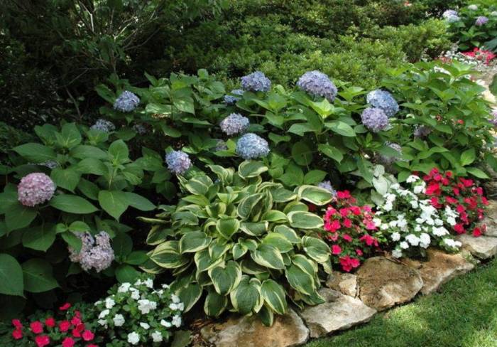 Гортензия в окружении декоративных многолетних растений — великолепное решение и его обязательно нужно воплотить в вашем саду.