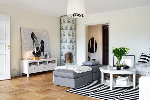 Скандинавский стиль отвергает все лишнее. Желая ему следовать, необходимо отказаться от украшения стен фотографиями, коврами, старинными картинами. Отличным украшением могут служить полотна, выполненные в стиле современного модерна. Если без фотографий не обойтись, то лучше всего в гостиной будут смотреться черно-белые снимки, развешанные в больших рамах над камином либо в области дивана. Черно-белые фотографии подчеркнут белизну и простор помещения, сделают его еще более уютным и привлекательным.