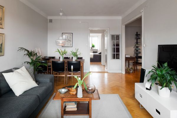 Можно сказать, что скандинавский интерьер монохромен, поэтому он нуждается в ненавязчивых акцентах: небольшие безделушки, яркие подушки на диване, пестрые цветочные горшки, коврики с разноцветным принтом в обеденной зоне.