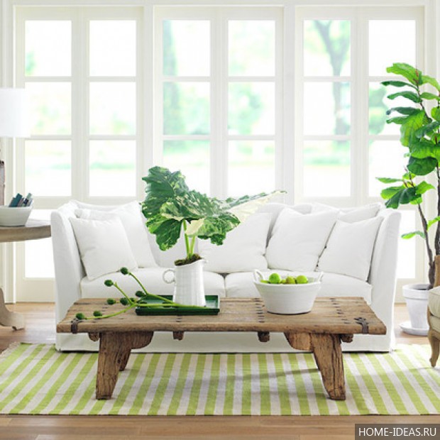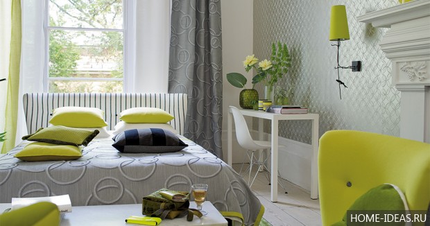 Травяной зеленый – один из самых проблематичных цветов в интерьере. Он очень насыщенный и яркий и тем привлекателен, но его активность быстро надоедает и нуждается в уравновешивающем цвете. Таким противовесом может стать белый и коричневый. Интерьер, конечно, остается очень активным, но воспринимается гораздо легче.