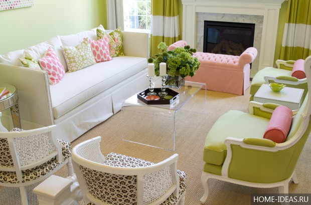Сочетание розовых и зелёных оттенков — это вкусная гармония лета, так называемый фруктово-ягодный букет. Он позволяет создать бодрое и весёлое настроение и несёт позитивный заряд для психики. Розовый и зелёный цвет в интерьере можно создать бутылочной окраской стен и обивкой мягкой мебели с розово-зелёными переливами. Хорошим дополнением будут шторы с цветами, столешницы из розового камня. Эта разноцветная палитра считается актуальной для спальни, кухни, гостиной и детской, подходит для классики и этностиля.