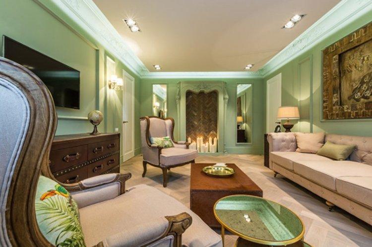 Если применяются светлые тона зеленого, в большинстве случаев необходима каштановая мебель или орех. В этом случае используются цвета любого нейтрального оттенка, тогда интерьер всегда будет выглядеть дизайнерски оформленным даже без наличия большого числа элементов отделки.
