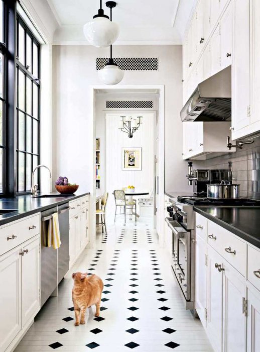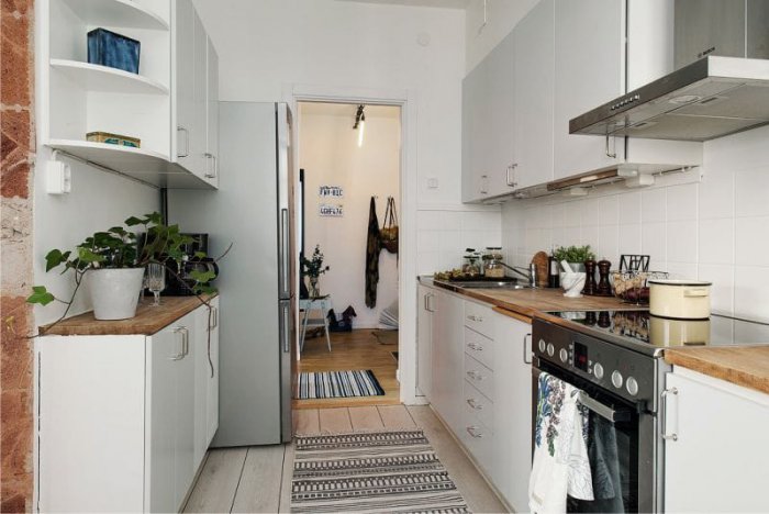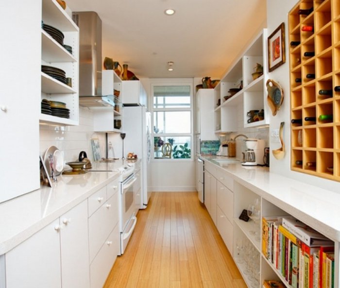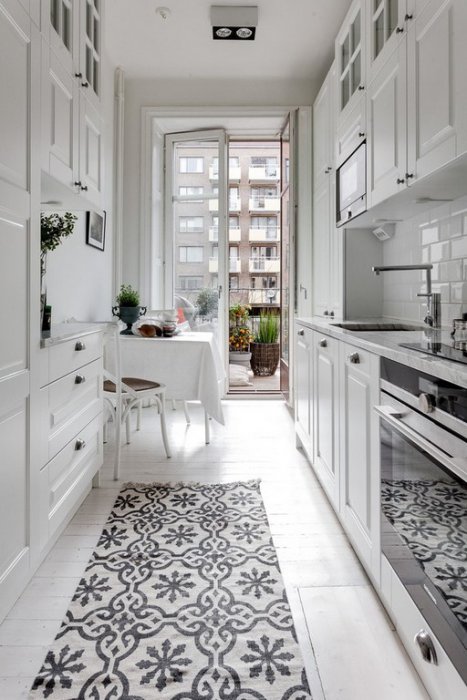 Белоснежная узкая кухня с хорошим естественным освещением