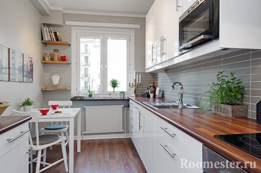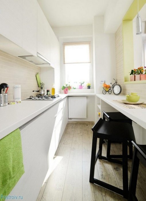 Планируя дизайн узкой кухни с окном в конце комнаты, рекомендуется подоконник использовать в качестве обеденного стола.