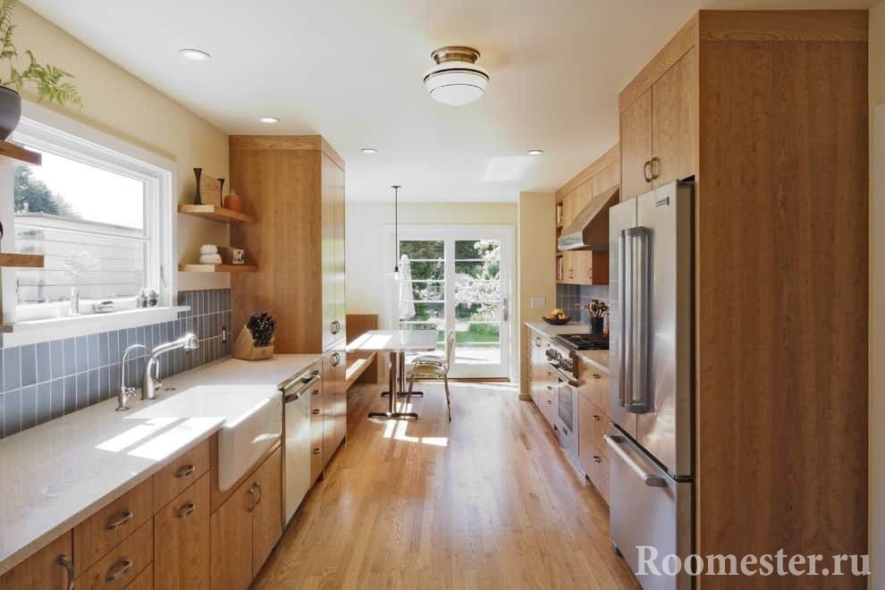 - Параллельная. Подходит для пропорционально прямоугольной комнаты. Гарнитур в таком помещении лучше расставить у двух противоположных стен. Ширина оставшегося пространства должна быть не менее 90 см. При соблюдении этого условия такая планировка считается удобной, позволяет реализовать правило «рабочего треугольника» (плита-мойка-холодильник).