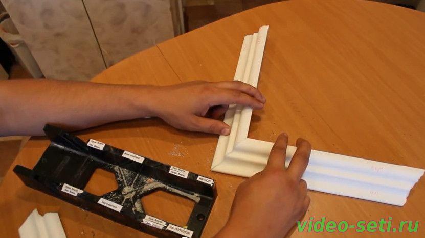 Режем угол потолочного плинтуса без стусла