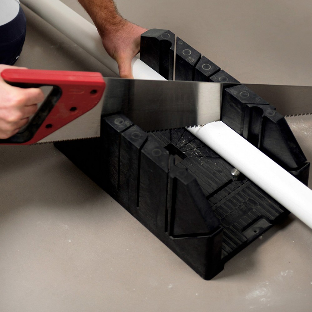 Убедившись, что материал установлен ровно, нужно поставить ножовку под 45 градусов в предназначенное для этого отверстие и обрезать деталь. Так обрабатывается внутренний угол.